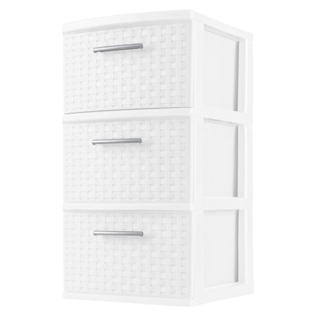 This decorative storage solution features a weave pattern and three drawers to help control clutter and organize. The stylish weave pattern and rich white color of the 3 drawer wide tower. Combines style and function the appealing woven pattern with the convenience, durability, and value of long lasting, easy to clean plastic.